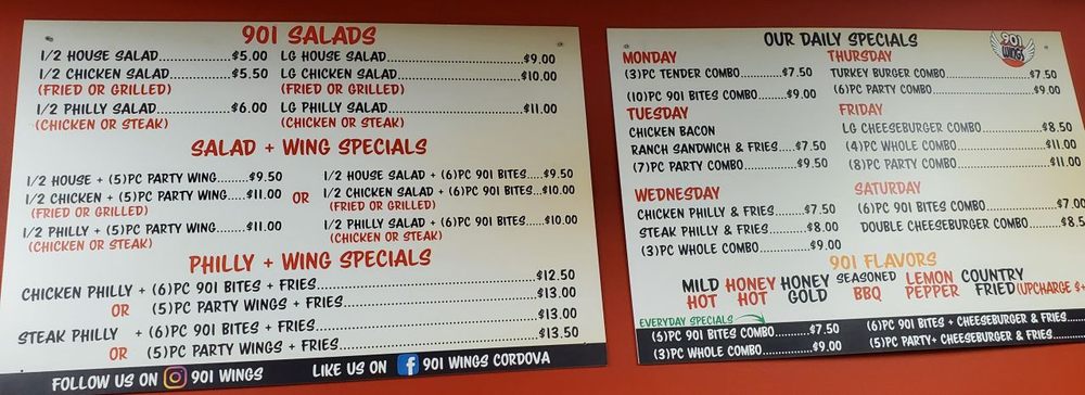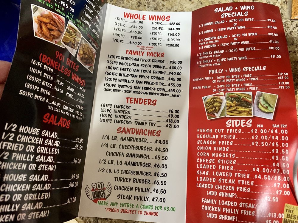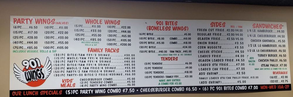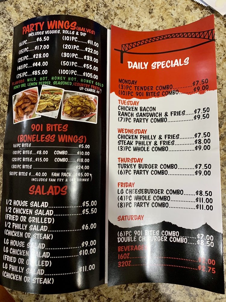 Introducing the menu at 901 Wings located in Southaven, MS. Known for their extensive selection of wings and bites, customers rave about the flavorful and well-seasoned dishes. Party wings come in various quantities, with bone-in or boneless options available. Whole wings are also a popular choice, with fried options that are crispy and delicious. Special combos like the 6pc Bite COMBO offer a mix of flavors and are perfect for sharing. Customers praise the hot wings for being perfectly fried and seasoned, while the lemon pepper variety adds a zesty twist. Despite some concerns about pricing, the overall quality of the food and improved service at the new location have left patrons satisfied. With a spacious dining area and a menu full of tasty options, 901 Wings is a must-visit for wing enthusiasts in the area.